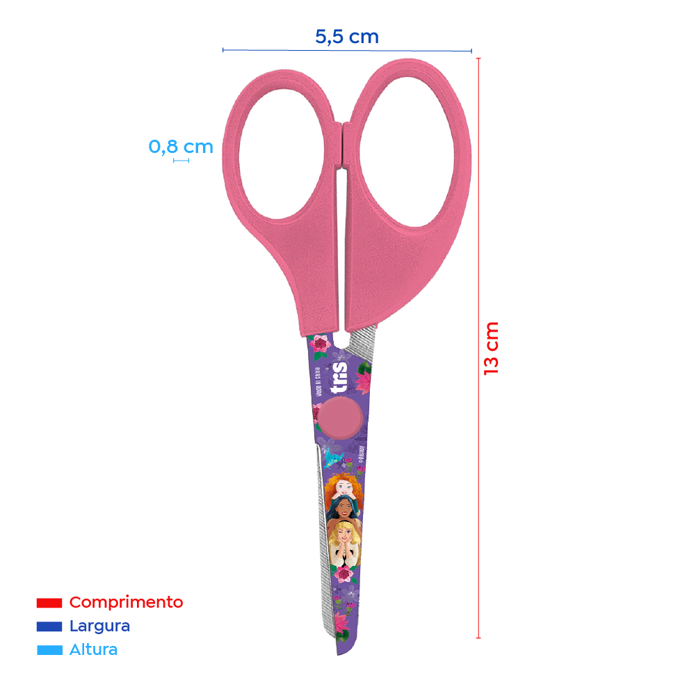 Com pontas arredondadas e cabo resistente em PP, a tesoura Princesas pos sui as lâminas decoradas, 13cm de comprimento total e 1,5mm de espessura de lâmina. É em aço inox, com cabo na cor rosa!